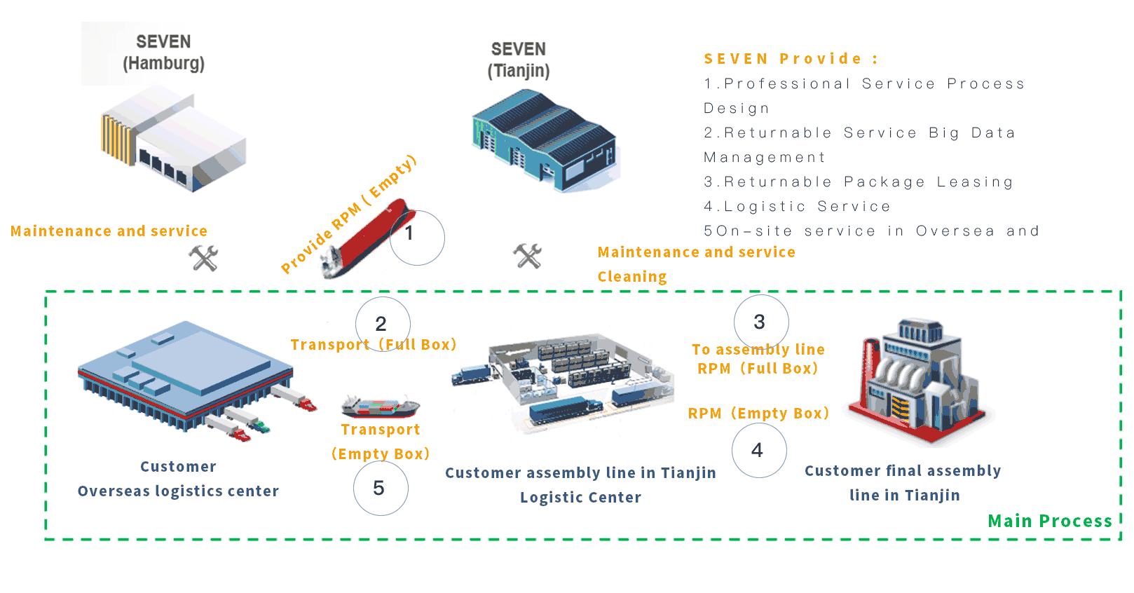 As returnable package takes the place of disposable packaging materials gradually, it can effectively integrate the transportation nodes of different logistics companies and promote the high-efficiency operation of the entire supply chain. SEVEN Group returnable packages are widely used for the circulation of automobile parts, and at customer requests, SEVEN Group can provide cleaning and other maintenance services to the returnable packages. Besides, thanks to the returnable and collapsible feature of our packages, they can significantly reduce the transportation and warehousing costs, and are also simple, environment-friendly, and energy-efficient. Our customers include Continental AG and other major automobile parts manufacturers.