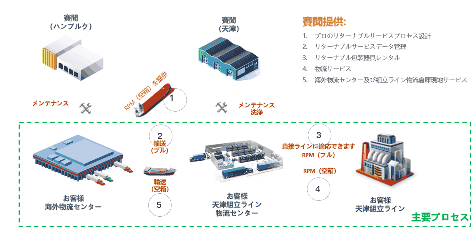 リターナブルはワンウェーに変わるとともに、各企業様の物流情報と連動し、リアルタイムで高効率にサプライチェンを推進します、賽聞グループのリターナブル包装は関連自動車業界各製品のの通い箱に使い、お客様のニーズにより、洗浄、輸送などリターナブル器具メンテナンスサービスを提供しております、リターナブル及び折畳コンテナーにより、包装輸送、倉庫コストを削減し、簡単で環境やさしく、省エネルギー、効率的です。当社のお客様は大陸自動車電子様などの自動車企業です。
